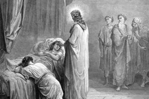 21 And when Jesus had crossed again in the boat to the other side, a great crowd gathered about him; and he was beside the sea. 22 Then came one of the rulers of the synagogue, Ja’irus by name; and seeing him, he fell at his feet, 23 and besought him, saying, “My little daughter is at the point of death. Come and lay your hands on her, so that she may be made well, and live.” 24 And he went with him. And a great crowd followed him and thronged about him. 25 And there was a woman who had had a flow of blood for twelve years, 26 and who had suffered much under many physicians, and had spent all that she had, and was no better but rather grew worse. 27 She had heard the reports about Jesus, and came up behind him in the crowd and touched his garment. 28 For she said, “If I touch even his garments, I shall be made well.” 29 And immediately the hemorrhage ceased; and she felt in her body that she was healed of her disease. 30 And Jesus, perceiving in himself that power had gone forth from him, immediately turned about in the crowd, and said, “Who touched my garments?” 31 And his disciples said to him, “You see the crowd pressing around you, and yet you say, `Who touched me?'” 32 And he looked around to see who had done it. 33 But the woman, knowing what had been done to her, came in fear and trembling and fell down before him, and told him the whole truth. 34 And he said to her, “Daughter, your faith has made you well; go in peace, and be healed of your disease.” 35 While he was still speaking, there came from the ruler’s house some who said, “Your daughter is dead. Why trouble the Teacher any further?” 36 But ignoring what they said, Jesus said to the ruler of the synagogue, “Do not fear, only believe.” 37 And he allowed no one to follow him except Peter and James and John the brother of James. 38 When they came to the house of the ruler of the synagogue, he saw a tumult, and people weeping and wailing loudly. 39 And when he had entered, he said to them, “Why do you make a tumult and weep? The child is not dead but sleeping.” 40 And they laughed at him. But he put them all outside, and took the child’s father and mother and those who were with him, and went in where the child was. 41 Taking her by the hand he said to her, “Tal’itha cu’mi”; which means, “Little girl, I say to you, arise.” 42 And immediately the girl got up and walked (she was twelve years of age), and they were immediately overcome with amazement. 43 And he strictly charged them that no one should know this, and told them to give her something to eat.