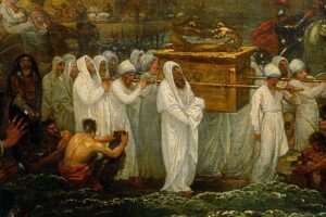 7 And the LORD said to Joshua, “This day I will begin to exalt you in the sight of all Israel, that they may know that, as I was with Moses, so I will be with you. 8 And you shall command the priests who bear the ark of the covenant, `When you come to the brink of the waters of the Jordan, you shall stand still in the Jordan.'” 9 And Joshua said to the people of Israel, “Come hither, and hear the words of the LORD your God.” 10 And Joshua said, “Hereby you shall know that the living God is among you, and that he will without fail drive out from before you the Canaanites, the Hittites, the Hivites, the Per’izzites, the Gir’gashites, the Amorites, and the Jeb’usites. 11 Behold, the ark of the covenant of the Lord of all the earth is to pass over before you into the Jordan. 13 And when the soles of the feet of the priests who bear the ark of the LORD, the Lord of all the earth, shall rest in the waters of the Jordan, the waters of the Jordan shall be stopped from flowing, and the waters coming down from above shall stand in one heap.” 14 So, when the people set out from their tents, to pass over the Jordan with the priests bearing the ark of the covenant before the people, 15 and when those who bore the ark had come to the Jordan, and the feet of the priests bearing the ark were dipped in the brink of the water (the Jordan overflows all its banks throughout the time of harvest), 16 the waters coming down from above stood and rose up in a heap far off, at Adam, the city that is beside Zar’ethan, and those flowing down toward the sea of the Arabah, the Salt Sea, were wholly cut off; and the people passed over opposite Jericho. 17 And while all Israel were passing over on dry ground, the priests who bore the ark of the covenant of the LORD stood on dry ground in the midst of the Jordan, until all the nation finished passing over the Jordan.