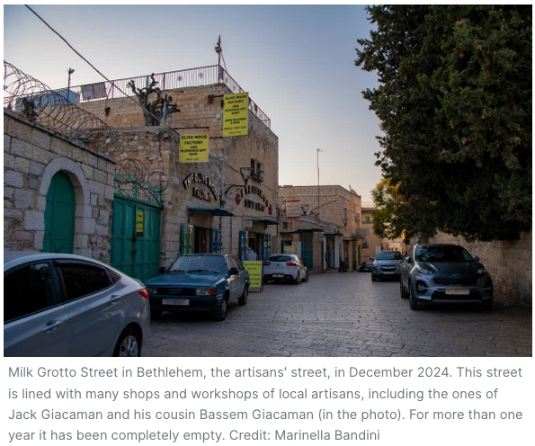 At the threshold of the shop’s entrance, Tabash looks at the empty streets around the Church of the Nativity. “Last year, we hoped that after Christmas the war would be over, but it’s still not finished. It’s getting worse; pilgrims no longer come to Bethlehem. People are struggling and not buying. For us artisans, the situation is really difficult,” he shared.